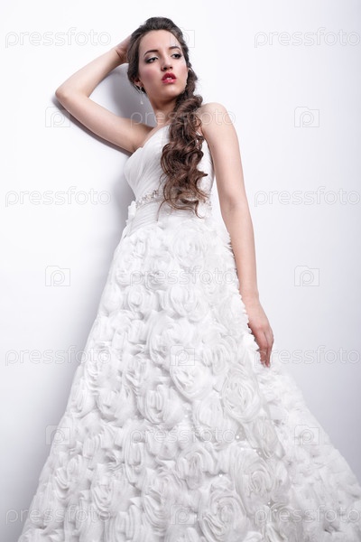 Портрет красивой молодой невесты брюнетки в белом свадебном платье
