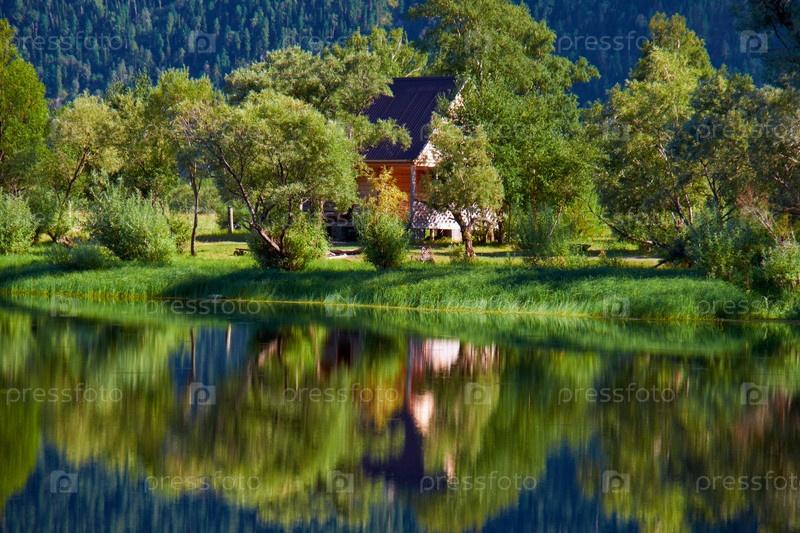 Маленькое деревянное бунгало на берегу залива в южной части Телецкого озера на Алтае