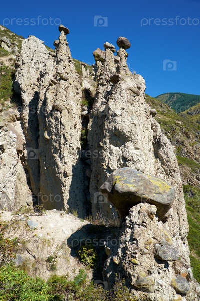 Феномен природы и чудо природы Каменные грибы скалы в горах Алтая у реки Чулышман