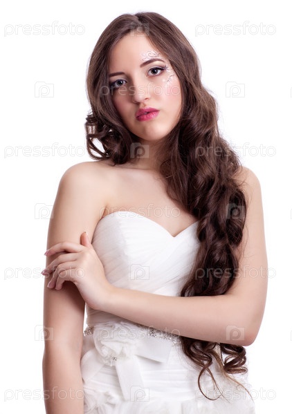 Портрет красивой молодой невесты брюнетки в белом свадебном платье