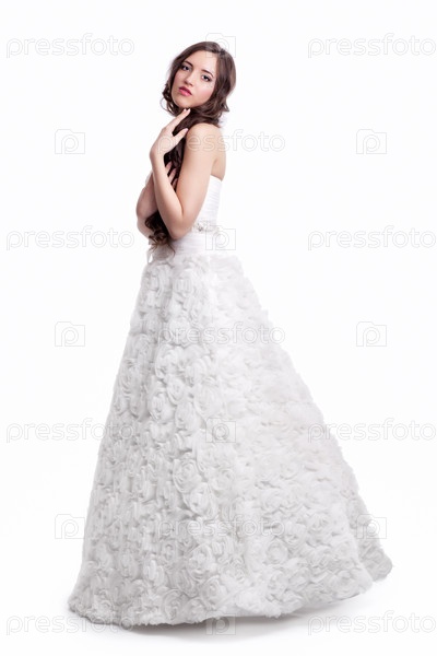 Портрет красивой молодой невесты брюнетки в белом свадебном платье