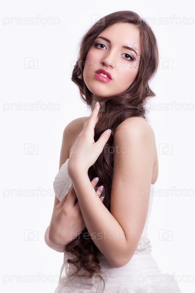 Портрет красивой молодой невесты брюнетки в белом свадебном платье