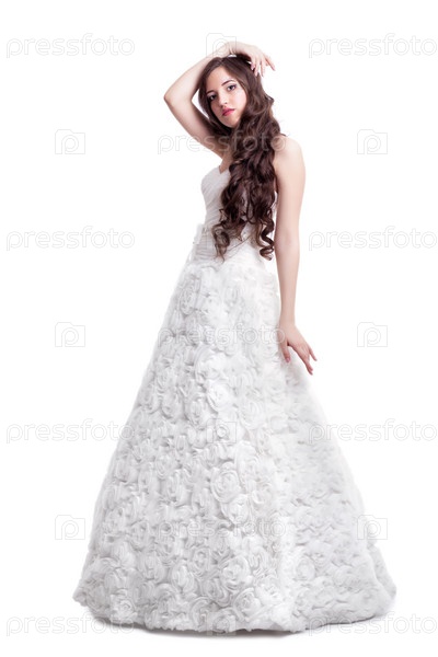 Портрет красивой молодой невесты брюнетки в белом свадебном платье