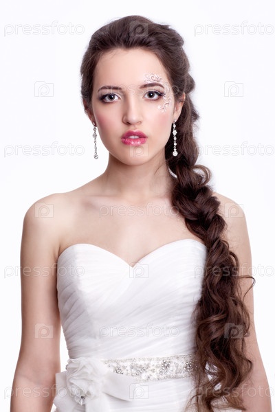 Портрет красивой молодой невесты брюнетки в белом свадебном платье