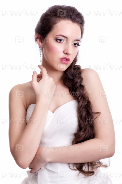 Портрет красивой молодой невесты брюнетки в белом свадебном платье