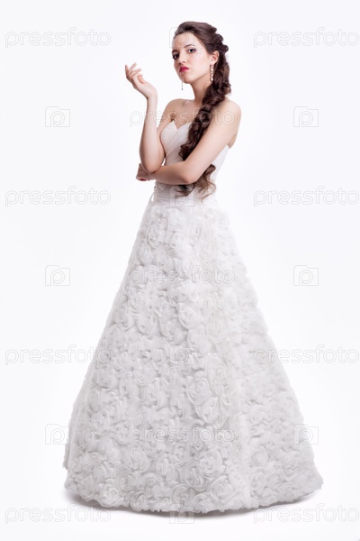 Портрет красивой молодой невесты брюнетки в белом свадебном платье