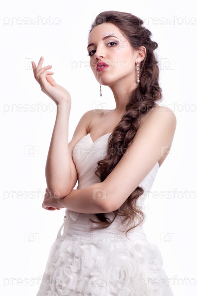 Портрет красивой молодой невесты брюнетки в белом свадебном платье