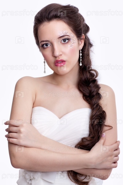 Портрет красивой молодой невесты брюнетки в белом свадебном платье