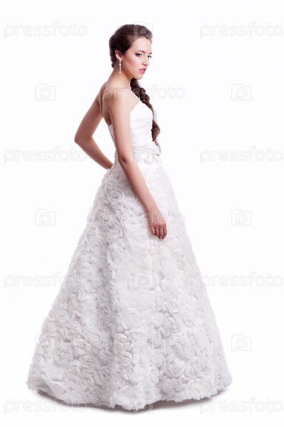 Портрет красивой молодой невесты брюнетки в белом свадебном платье