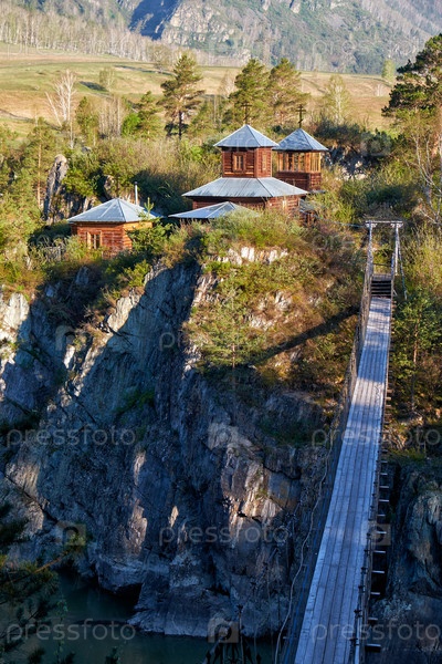 Подвесной мост к монастырю на острове Патмос на реке Катунь в Чемале, Алтай, Сибирь