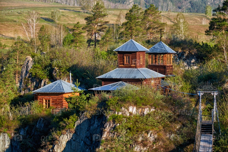 Подвесной мост к монастырю на острове Патмос на реке Катунь в Чемале, Алтай, Сибирь