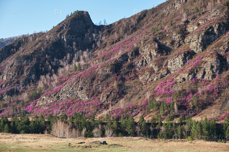 Склоны гор покрыты кустами Rhododendron dauricum с цветами (народные названия багульник, маральник)