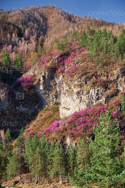 Склоны гор покрыты кустами Rhododendron dauricum с цветами (народные названия багульник, маральник)