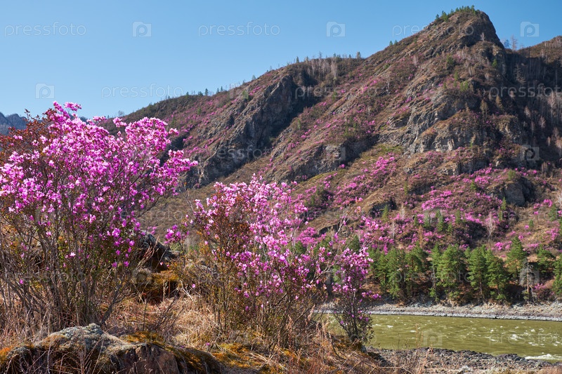 Кусты рододендрона даурского с цветами (народные названия багульник, маральник) на фоне алтайской реки Катуни и гор