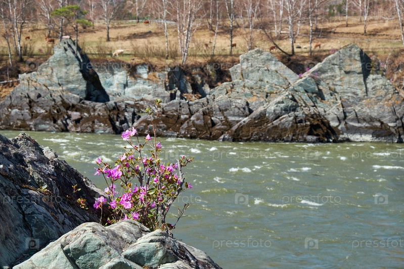 Кусты рододендрона даурского с цветами (народные названия багульник, маральник) на фоне алтайской реки Катуни и гор