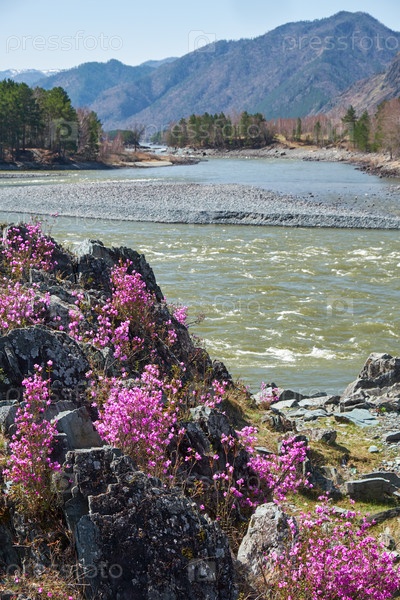 Кусты рододендрона даурского с цветами (народные названия багульник, маральник) на фоне алтайской реки Катуни и гор