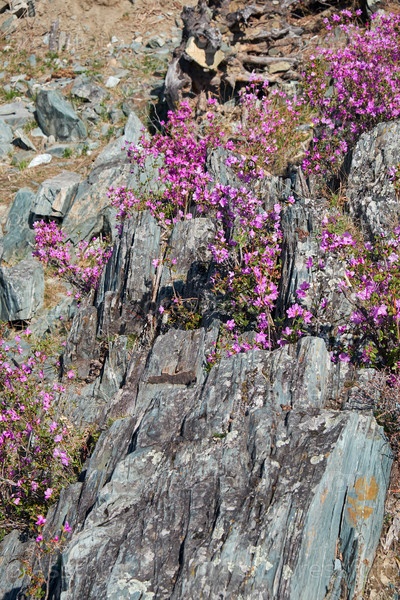 Склоны гор покрыты кустами Rhododendron dauricum с цветами (народные названия багульник, маральник)