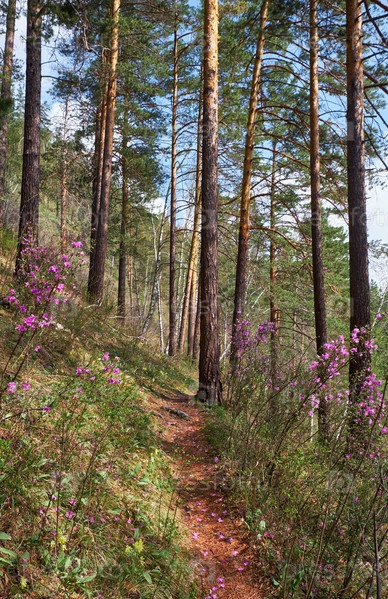 Сосновый бор с кустами Rhododendron dauricum с цветами (народные названия багульник, маральник)