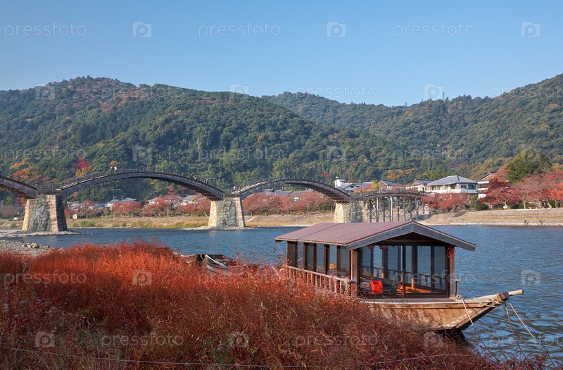 Лодка васэн и мост Кинтай через реку Нишики в Ивакуни. Япония
