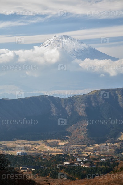 Вершина горы Фудзи в облаках. Район Хаконе префектуры Канагава на острове Хонсю. Япония