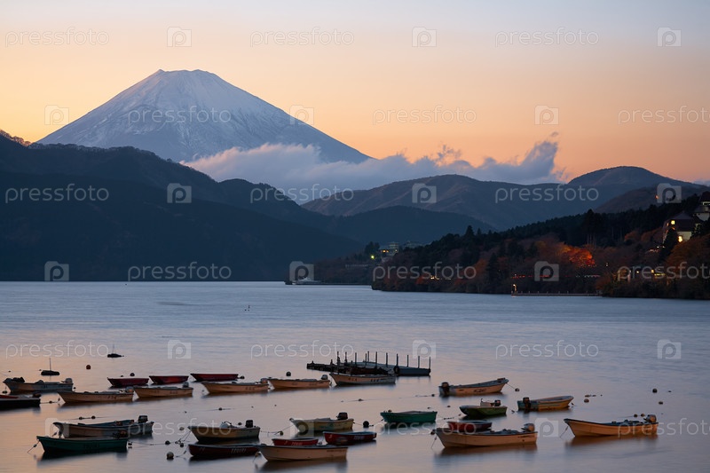 Вид на вершину горы Фудзи на закате над озером Аши. Префектура Канагава. Хонсю. Япония