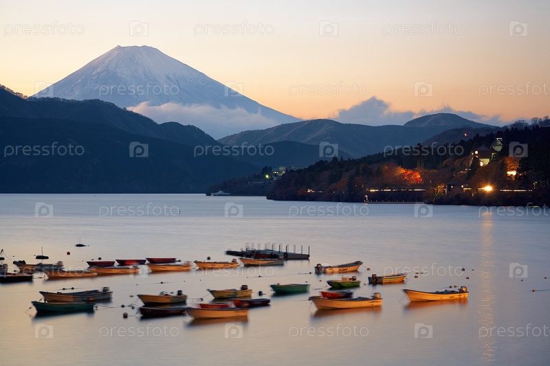 Вид на вершину горы Фудзи на закате над озером Аши. Префектура Канагава. Хонсю. Япония