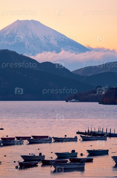 Вид на вершину горы Фудзи на закате над озером Аши. Префектура Канагава. Хонсю. Япония