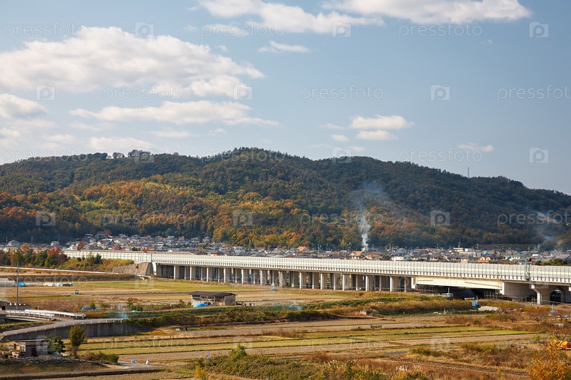 Вид на японскую сельскую местность с автомобильным мостом и лесистыми холмами на заднем плане