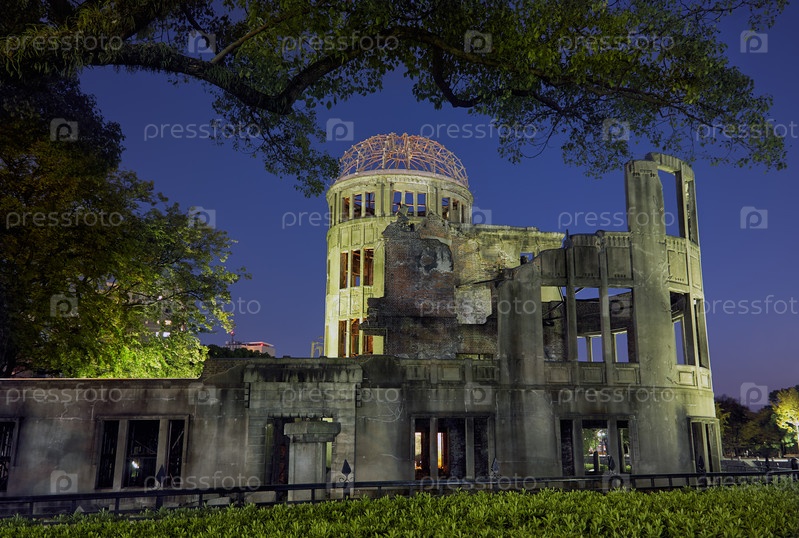 Скелетные руины Купола атомной бомбы ночью. Хиросима. Япония