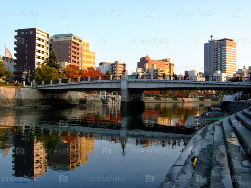 Современный реконструированный мост Айой через реку Ота в центре Хиросимы. Япония