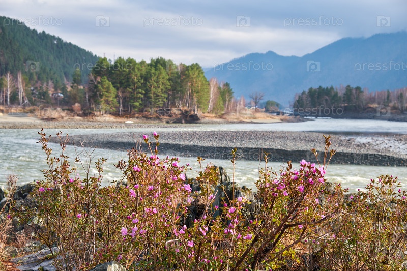 Кусты рододендрона даурского с цветами (народные названия багульник, маральник) на фоне алтайской реки Катуни