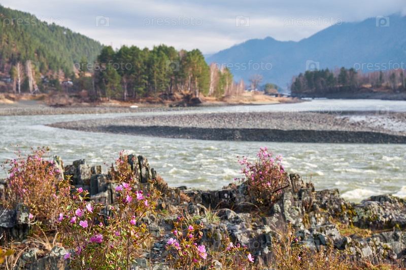 Кусты рододендрона даурского с цветами (народные названия багульник, маральник) на фоне алтайской реки Катуни