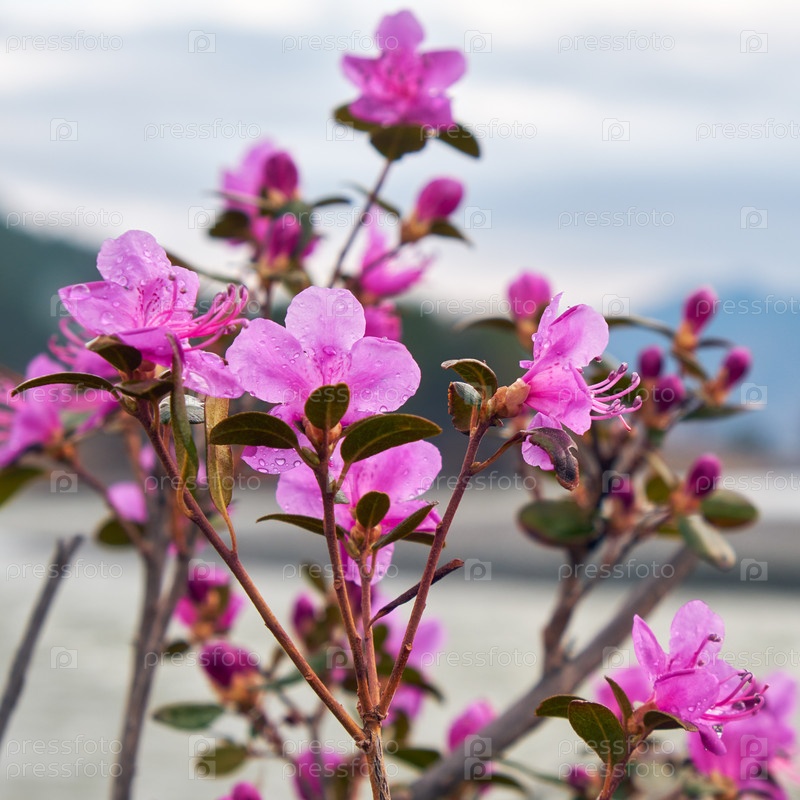 Фотографии с крупным планом цветов Rhododendron dauricum (популярные названия багульник; маралник) на фоне Алтайской реки Катун