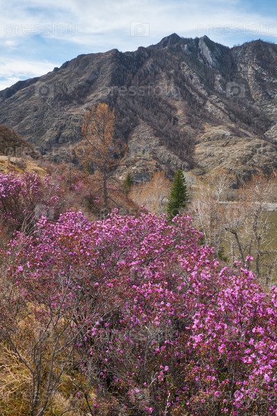Кусты рододендрона даурского с цветами (народные названия багульник, маральник) на фоне алтайской реки Катуни