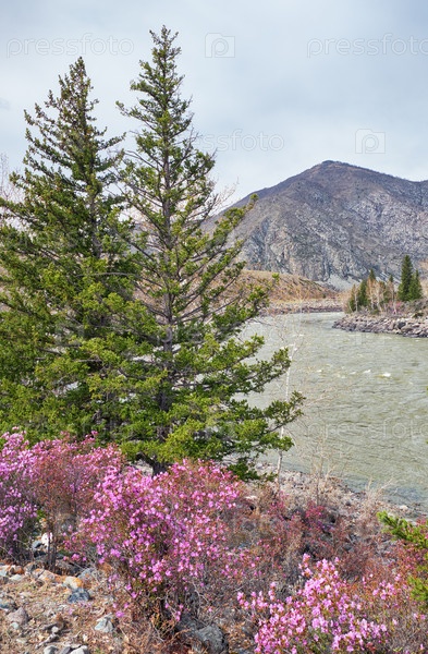 Кусты рододендрона даурского с цветами (народные названия багульник, маральник) на фоне алтайской реки Катуни и гор
