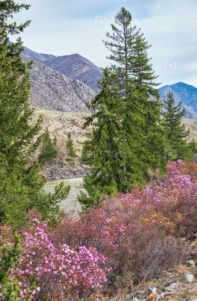 Кусты рододендрона даурского с цветами (народные названия багульник, маральник) на фоне алтайской реки Катуни и гор