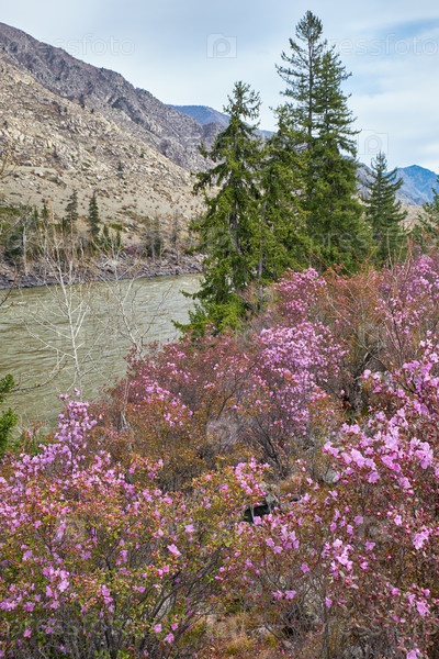 Кусты рододендрона даурского с цветами (народные названия багульник, маральник) на фоне алтайской реки Катуни и гор
