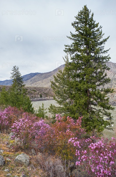 Кусты рододендрона даурского с цветами (народные названия багульник, маральник) на фоне алтайской реки Катуни и гор