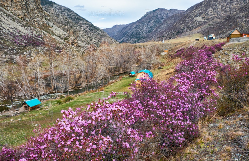 Алтайский пейзаж с Rhododendron dauricum в цветущих цветах на берегу алтайской реки Ильгумен