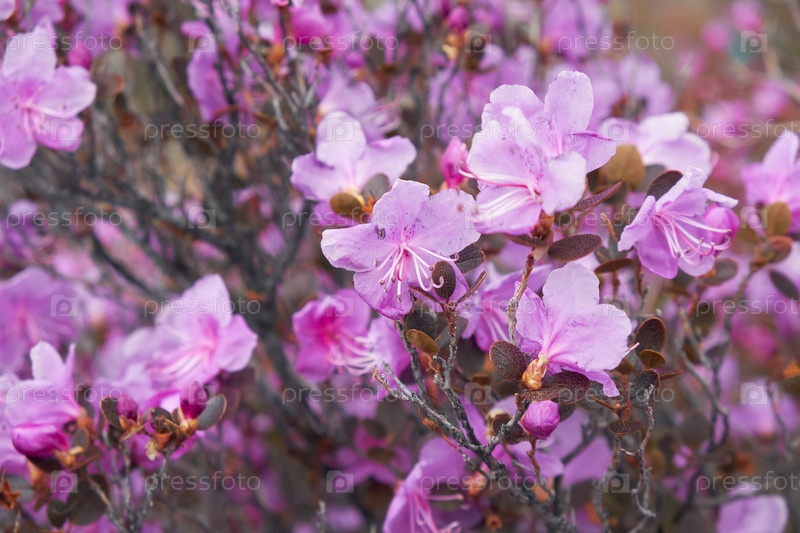 Снимок крупным планом цветков рододендрона даурикума (популярные названия багульник; маральник)