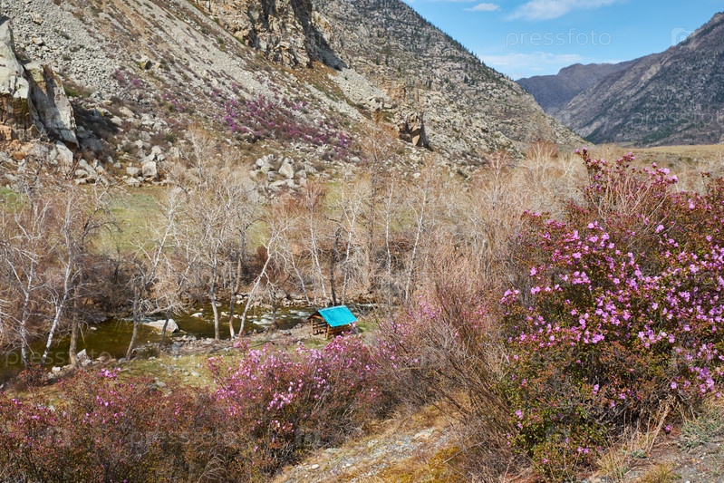 Алтайский пейзаж с Rhododendron dauricum в цветущих цветах на берегу алтайской реки Ильгумен