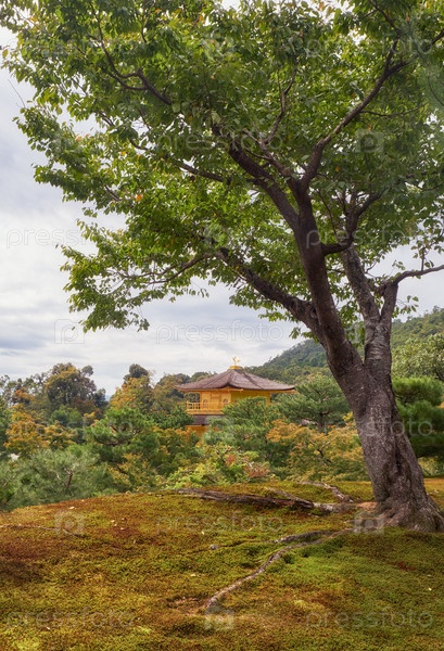 Старое дерево сакуры в моховом парке храма Кинкаку-дзи (Рокуон-дзи). Киото. Япония