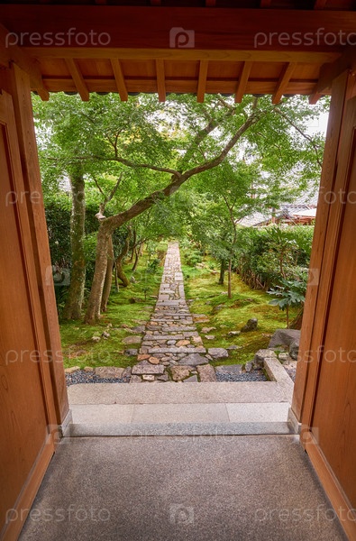 Вид через деревянные ворота в сад с каменной дорогой. Киото.Япония