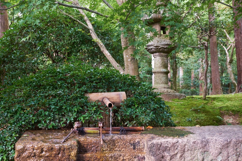 Ритуальный бамбуковый умывальник (цукубай) у входа в храм Реан-дзи. Киото. Япония