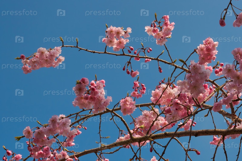 Розовые вишневые цветы сакуры на фоне голубого неба. Япония