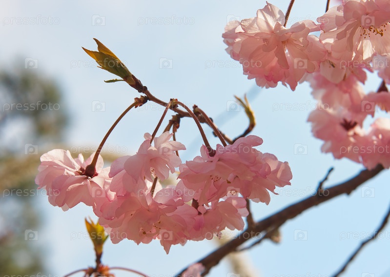 Розовые вишневые цветы сакуры на фоне голубого неба. Япония