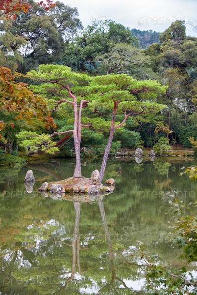 Сосны на островке пруда Кеко-ти в саду храма Кинкаку-дзи. Киото