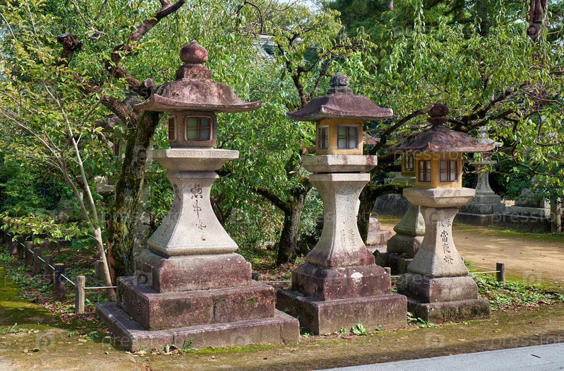 Традиционные каменные квадратные фонари каку-доро в храме Китано Тенмангу. Киото. Япония