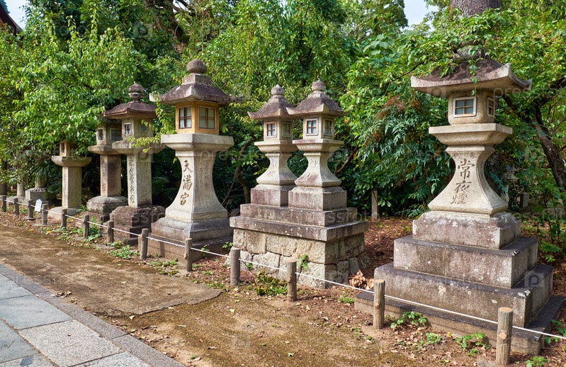 Традиционные каменные квадратные фонари каку-доро в храме Китано Тенмангу. Киото. Япония