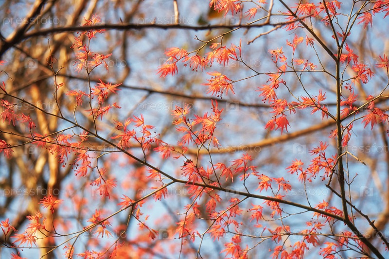 Молодые красные листья японского клена весной. Япония